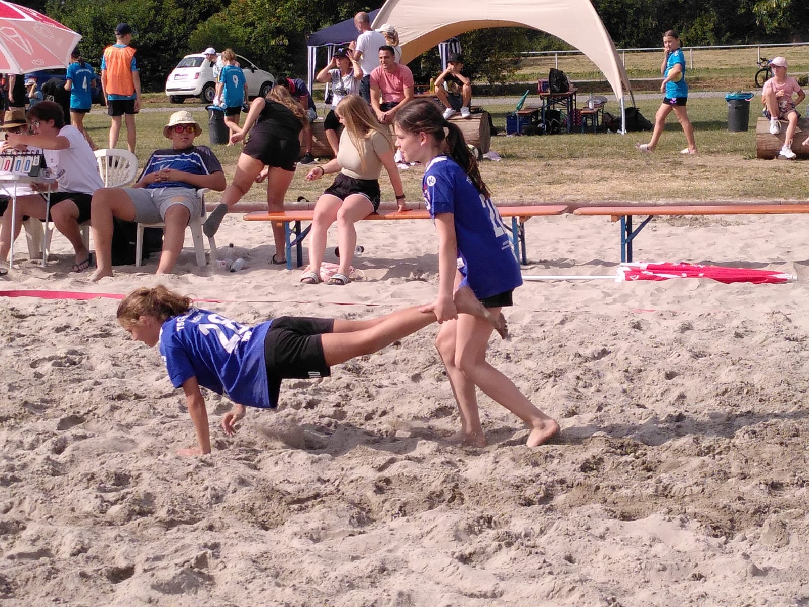 Bei bestem Sommer-Beach-Wetter konnten die Mädels zum ersten Mal ihr Können im Sand unter Beweis stellen. Nach zwei knappen Siegen im Penalty-Werfen und einer Niederlage gegen den späteren Turniersieger erreichte man das Halbfinale. Hier musste man sich leider geschlagen geben, so dass es im letzen Spiel noch um den dritten Platz ging.